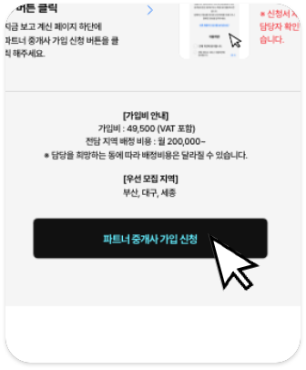 지금 보고 계신 페이지 하단에 파트너 중개사 가입 신청 버튼을 클릭 해주세요.